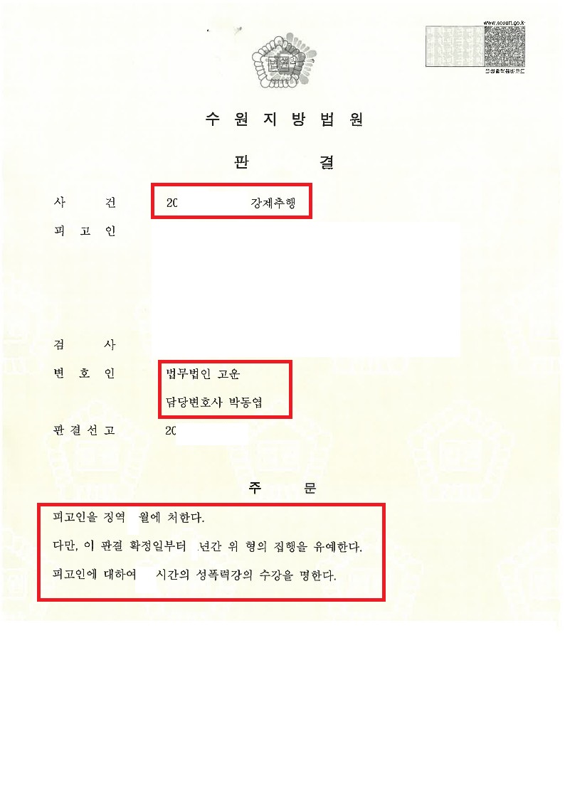 법무법인 고운은 먼저 의뢰인이 실수일지라도 자신이 강제추행 혐의를 저질렀다는 사실을 인정하였고, 그에 대해 진심으로 반성하고 있다는 사실을 주장했습니다. 그리고 피해자에게 지속적으로 사과 의사를 전달한 점, 피해회복을 위해 많은 노력을 한 점, 피해자의 거부의사에 즉시 범행을 멈춘 점 등 의뢰인에게 유리한 점을 적극 주장하였습니다. 그리고 의뢰인 대신 합의에 나서 피해자와 합의하는데 성공하였습니다.