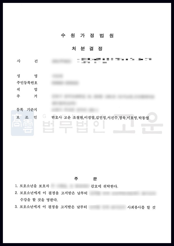 6호 이상의 처분을 받게 되면 소년보호시설, 소년원 등 시설에 수감될 수 있어, 부모님과 보호소년이 큰 충격을 받을 수가 있습니다. 해당 사건의 보호소년은 이미 5호의 보호처분을 받은 전력이 있어 어려운 상황이었으나, 낮은 수위의 보호처분으로 마무리했다는 것에 의미가 있는 사건이었습니다.