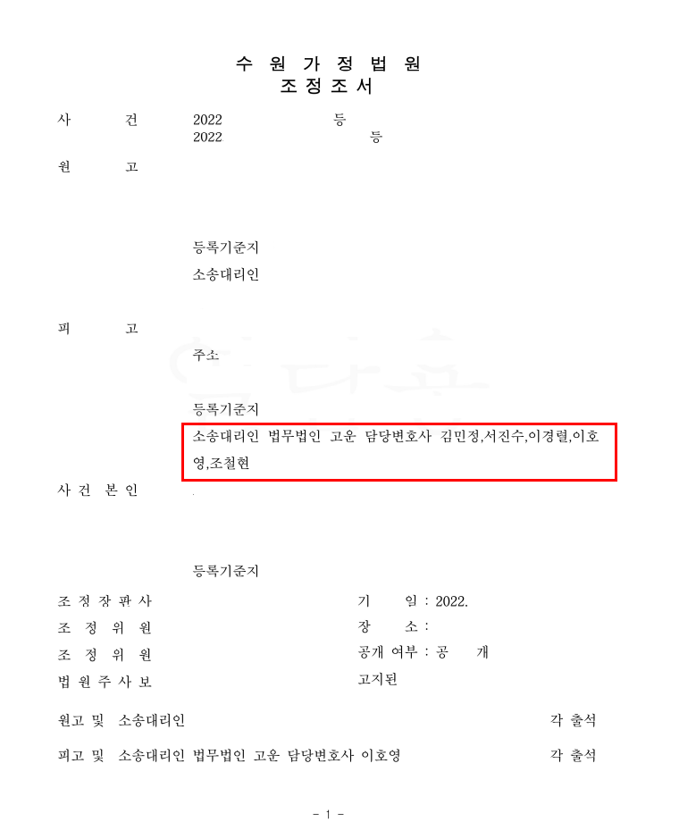이에 법무법인 고운은 재판 전 B씨와 합의안을 조율하였고, 결국 조정기일 전 구체적인 합의에 이르러 조정절차를 통하여 의뢰인 A씨가 자녀의 친권자 및 양육자로 지정되고 당초 바라던 방식으로 재산분할을 하는 것으로 조정이 성립되었습니다