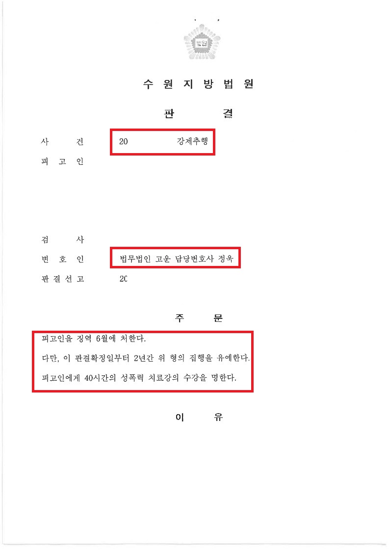 재판부는 법무법인 고운의 주장을 받아들여 의뢰인에게 집행유예 판결과 수강명령 처분만을 내렸습니다. 실형과 신상정보 공개와 같은 심각한 보안처분을 피했다는 사실에 의뢰인은 매우 만족하였습니다.