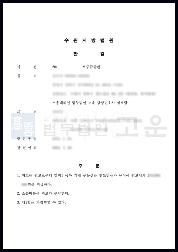 재판부는 법무법인 고운의 주장을 모두 받아들여 B에게 보증금을 전액 반환하라는 판결을 내렸습니다. B의 연락이 두절 되어 불안했던 상황 속에서, 늦었지만 보증금을 반환받을 수 있는 법률적인 명확한 근거를 마련하게 되었다는 사실에 의미가 있는 사건이었고, A도 해당 결과에 매우 만족하였습니다.