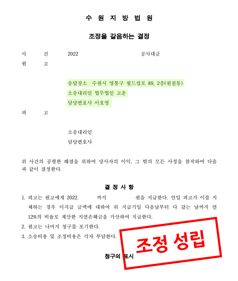 재판부는 법무법인 고운의 주장을 대부분 받아들여 피고 B씨에게 법무법인 고운에서 청구한 공사대금 대부분을 A씨에게 지급하라고 권하였고