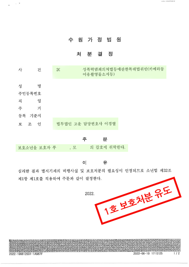 매우 낮은 수위의 보호처분을 내리며 가족의 곁으로 돌아갈 수 있게 해 주었습니다.