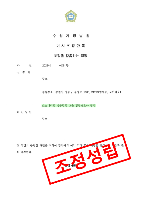 결국 의뢰인 A씨가 원하는 금액의 재산분할금을 인정받으며 원만히 조정이 성립되어