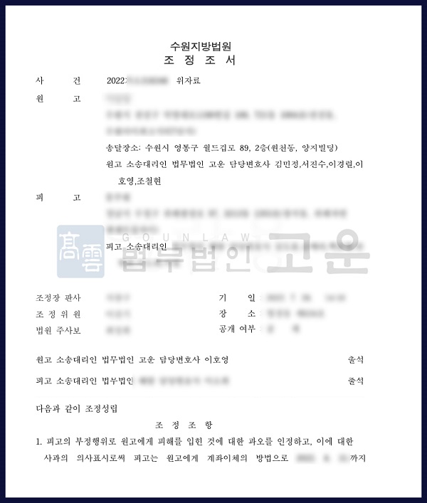 그러나 재판부는 고운의 주장을 받아들여, C씨는 A씨에게 상당한 액수의 위자료를 지급하라는 취지로 조정을 권하였고, C씨는 결국 의뢰인 A씨에게 사과와 함께 상당한 액수의 위자료를 지급하기로 하였습니다. 이에 의뢰인은 상당한 위자료 금액과 함께 사과까지 받게 되어 매우 만족하였습니다.
