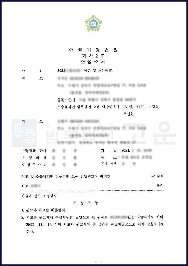 결국 조정기일에 의뢰인 A씨가 원하는 금액의 위자료와 재산분할금을 인정받는 내용으로