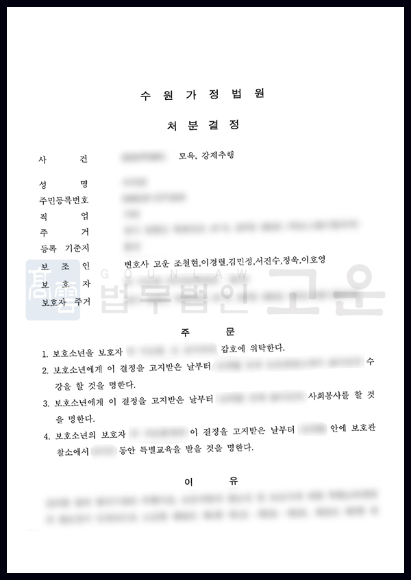 그 결과 재판부는 법무법인 고운의 주장을 받아들여 A에 대해 소년분류심사원 위탁 처분을 내리지 않고, 비교적 경미한 1, 2, 3호 처분만 내렸습니다.