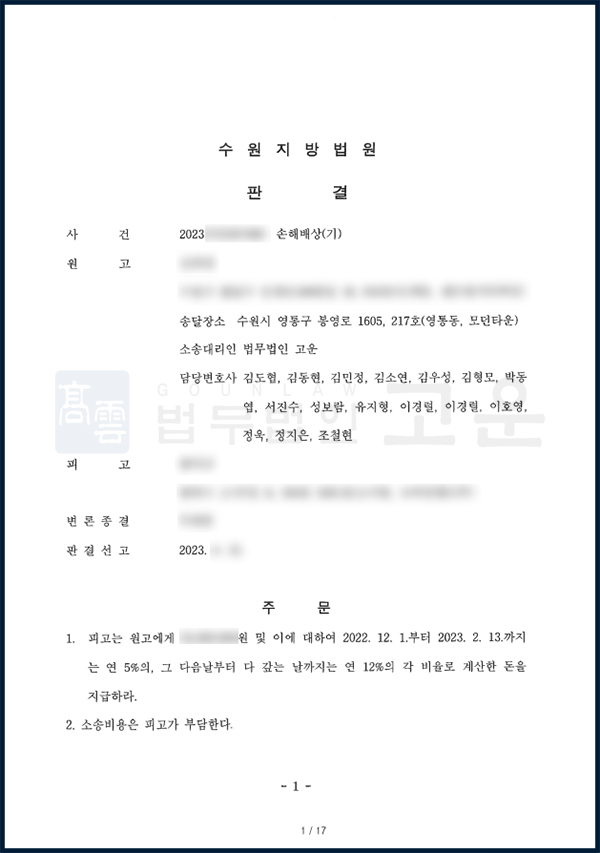 재판부는 법무법인 고운의 주장을 받아들여 피고 B씨에게 A씨에게 빌린 금원 및 이자 전액과 소송비용을 모두 부담하라는 판결을 내렸습니다. 의뢰인 A씨는 좋은 결과에 매우 만족하였습니다.