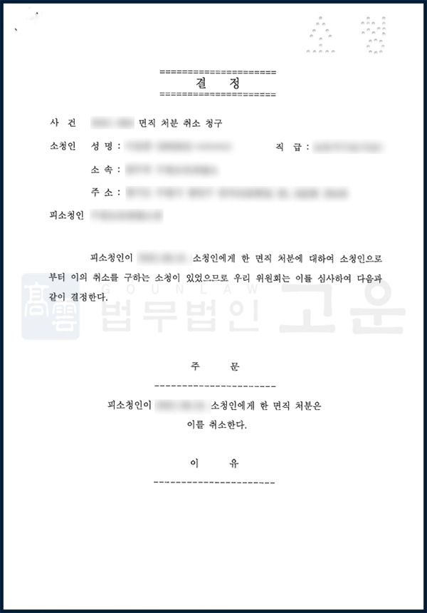 결국 해당 소청심사위원회에서는 A씨의 사례가 절차상 중대한 하자가 있는 경우에 해당된다고 판단하여 A씨의 면직처분취소를 인용하였습니다. A씨는 법무법인 고운의 조력 덕분에 다시 공직생활에 복귀하게 될 수 있었습니다.