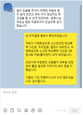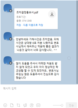 본 사건의 A의 부모님도 어린 아이가 학폭을 당한 것도 억울한데, 학폭으로 신고까지 당하자 극심한 스트레스에 시달리며, 적극적은 도움을 호소하였고, 확인되지 않은 정보들로 인해 방향을 잡지 못하고 있었습니다. 그러다가 결국 결국 학교폭력전문 변호사에게 도움을 요청하였고, A의 부모님이 생각한 최상의 결과로 사건이 마무리 되었습니다.