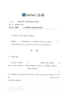 라. 또한 고운은 평소 A와 B가 학교에서 어떤 생활을 했는지, 그리고 친구들과의 관계 등 두 당사자의 관계를 좀 더 깊이있게 확인하고 들어갔으며, 이 사건의 구체적인 경위 그리고 형사사건 변호인 의견서 수준의 증거를 정리해 의견서를 작성했고, 학폭위에 제출하며 심문기일을 준비했습니다.