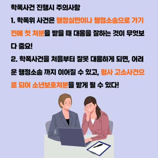 학교 폭력 사건은 비교적 경미한 사건이라고 인식하고, 전문가 상담 한 번 없이 사건을 진행하는 경우가 많습니다. 그러다가 막상 억울한 학폭 처분을 받고, 그때서야 변호사를 찾아 상담하는 의뢰하게 되는데, 학폭위 사건은 행정심판이나 행정소송으로 가기 전에 첫 처분을 받을 때 대응을 잘하는 것이 무엇보다 중요하다는 점을 기억하셔야 합니다.