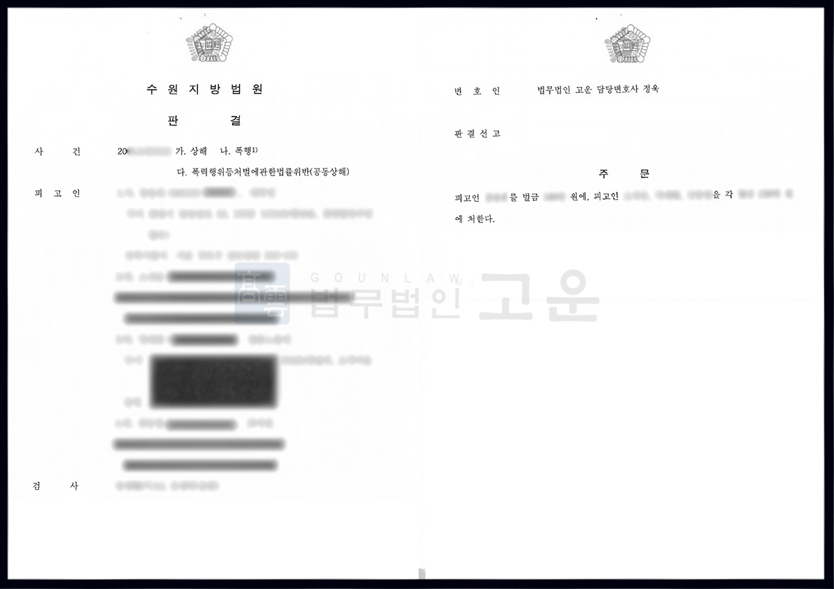 법무법인 고운은 의뢰인이 술에 취해 폭력을 저지른 자신의 행위에 대해 진심으로 반성하고 있다는 점을 주장했습니다. 그리고 상대가 상해까지 입긴 했지만 상대방 역시 의뢰인에게 폭력을 휘두르는 등 일방적인 폭행이 아니었다는 점, 서로 잘못을 인정하고 사과하여 합의에 이른 점, 처벌불원 의사가 제출된 점 등 의뢰인의 처벌을 낮추기 위해 최선을 다했습니다.