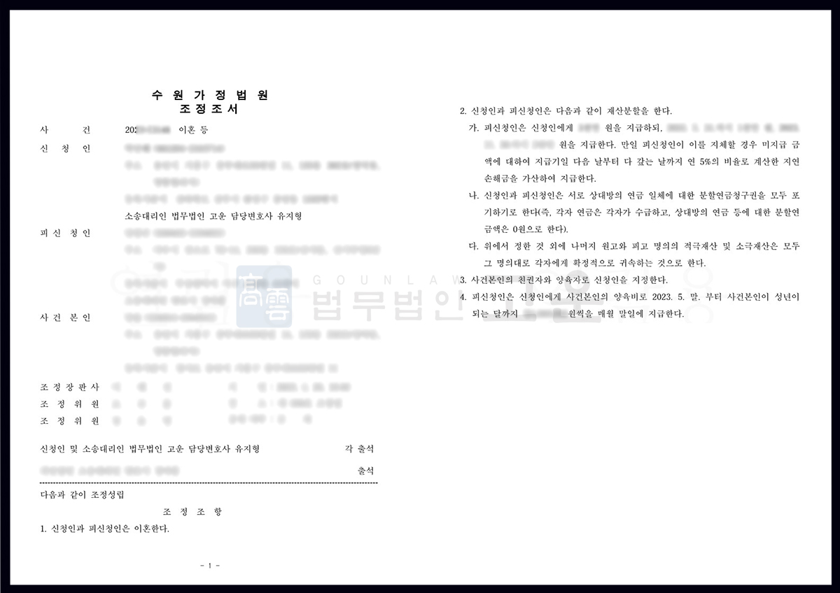 그 결과 조정 신청을 한 지 2개월 반 만에 조속하고 원만히 조정이 성립되어 이혼 절차가 마무리되었고, 당초 A씨가 청구한 재산분할금과 양육비 전액을 받는 만족스러운 내용으로 조정이 성립되었으며, 면접교섭의 방법 또한 자녀의 복리에 가장 적절하고 안정적인 방법으로 정하게 되었으므로, A씨는 결과에 매우 만족하였습니다.