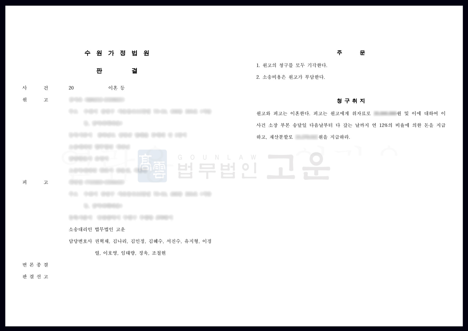 다. 법무법인 고운은 B씨가 주장하는 A씨의 귀책사유가 사실이 아니라는 점과 A씨가 가정을 위하여 노력한 점, 오히려 B씨가 혼인관계 유지를 위한 노력 없이 오히려 악화시키는 언행들을 한 점 등을 입증하였고, A씨의 이혼 청구 및 그 외 위자료 및 재산분할 청구 또한 이유가 없음을 밝혔습니다.