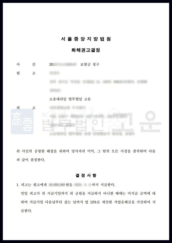 이에 법무법인 고운은 필요한 서류를 문서제출명령을 통하여 확보하는 한편, 확보한 서류를 정확히 분석하여 해당 보험금은 계악서상 상속을 통해 지급되는 것이 아닌 수익자에게 지급되는 것이라는 부분을 지적하였습니다. 이를 통해 상속인이 아닌 전혼 배우자 A가 보험금을 지급받을 자격이 있음을 입증할 수 있었고, 자살의 경우에도 사망 보험금 지급이 가능하다는 부분도 인정받았기에 의미가 있는 사건이었습니다.