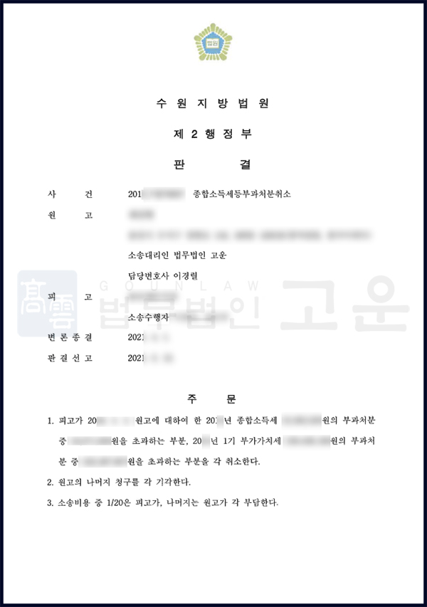 재판부는 모든 증거를 종합하여, 의뢰인 A씨를 근로자로 보기 어렵고 A씨가 B사로부터 공사를 하도급받은 것이라고 판단하였으나, 세액 산출의 부당함에 대한 부분은 법무법인 고운의 주장을 대부분 받아들여, 피고의 과세처분에는 세액의 산출과정에 잘못이 있어 과세처분이 위법하다고 판단하였고, 피고의 과세처분 중 정당한 산출세액을 초과하는 부분에 대하여 위법하여 취소되어야 한다는 조세부과처분 취소 판결을 하였습니다.