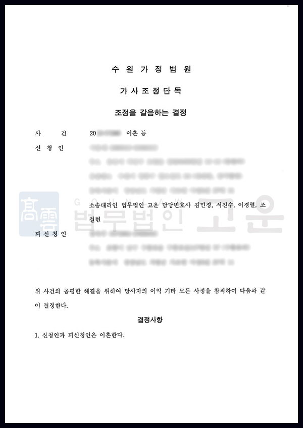 A씨와 배우자 B씨는 약 20년간의 혼인 후 협의이혼에 합의했으며, A씨는 법원 출석 없이 신속한 이혼을 원했습니다. 법무법인 고운은 이혼 합의서를 작성하고 향후 위자료·재산분할 청구를 하지 않기로 합의한 뒤, A씨를 대리해 이혼 조정을 진행했습니다. 그 결과 재판 출석 없이 약 2개월 만에 이혼을 마무리하는 조정결정을 받아 A씨는 만족하였습니다.
