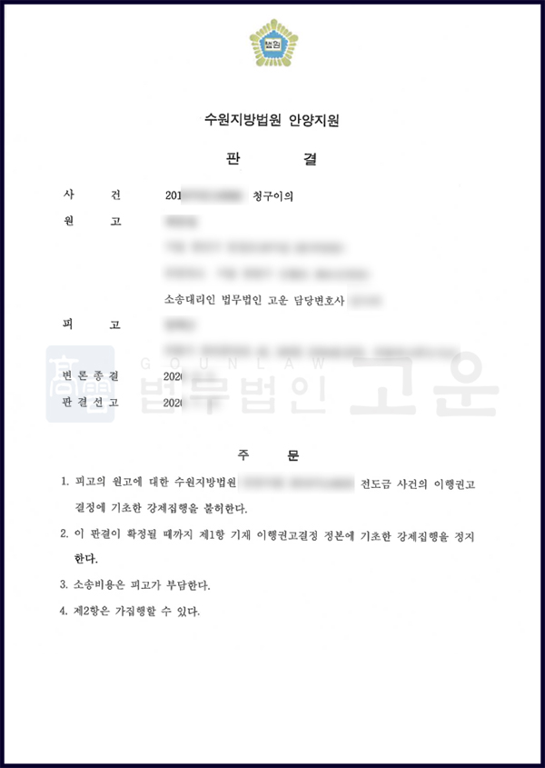 재판부는 전도금 사건의 강제집행을 정지하고, 소송비용 역시 피고가 부담하라는 판결을 내렸습니다. A씨는 법무법인 고운의 치밀한 대응전략을 기반으로 한 소송 결과에 크게 만족하였습니다.
