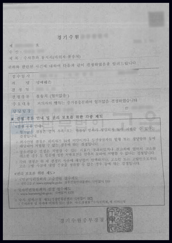 수사기관은 법무법인 ‘고운의 명예훼손적 고의도 없고, 사실적시 내용이 공공의 이익에 부합하여 위법성이 조각된다’는 주장을 받아들였고, A에게 명예훼손 혐의가 없다고 판단하여 무혐의 처분을 내려 재판에 가지 않고 수사단계에서 사건이 종결되었습니다. 적반하장 식 고소로 억울하게 형사처벌 위기에 놓였던 A는 처벌 위기에서 완전히 벗어나게 되어 매우 만족하였습니다.