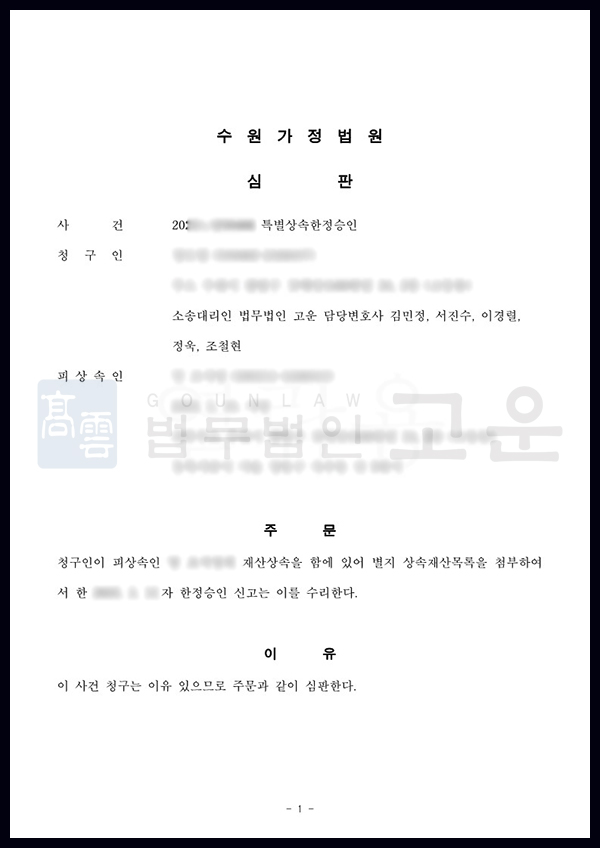 다. 특별한정승인의 경우 채무의 존재에 대해 알지 못했다는 것을 명확히 소명하여야 인용 심판을 받을 수 있기에 고운은 A씨가 채무의 존재에 대해 알 수 없었다는 사실을 구체적인 근거와 함께 입증하는 것은 물론 최근 법원으로부터 승계집행문을 송달받은 후에야 비로소 채무를 인지하게 되었다는 점을 적극적으로 소명하였습니다.