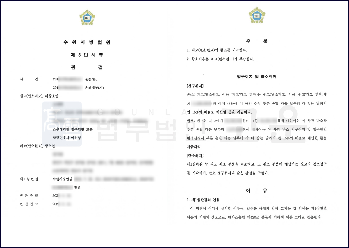 재판부는 법무법인 고운의 주장을 인용하여 피고의 주장에 근거가 없음을 이유로 반소를 기각하며 재판비용 역시 B사가 부담하라는 판결을 내렸습니다. 법무법인 고운에서 치밀하게 준비한 덕분에 법정 다툼에서 승리할 수 있었던 A사는 결과에 매우 만족하였습니다.