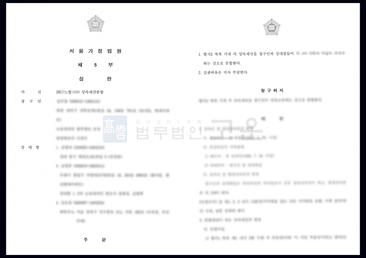 재판부는 법무법인 고운의 주장을 모두 인용하여 상속재산인 예금과 부동산에 대해 형제들이 1/n의 비율로 분할해서 상속받도록 전부승소 결정하였고, 의뢰인은 결과에 매우 만족하였습니다.