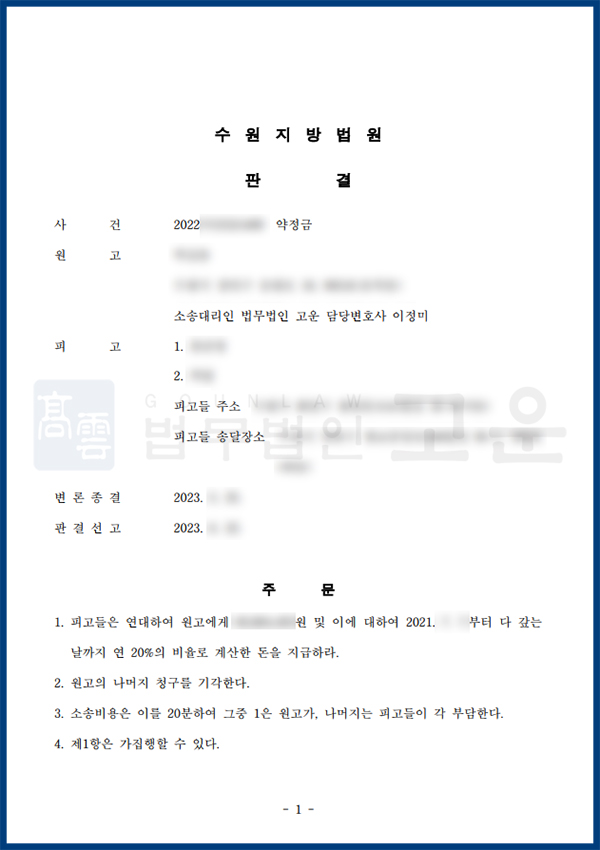 가. 법무법인 고운은 A씨가 B씨에게 돈을 빌려주게 된 경위와 대화내역, 차용증 등의 관련 서류를 확인한 뒤 약정금 청구 소송을 진행하였습니다.