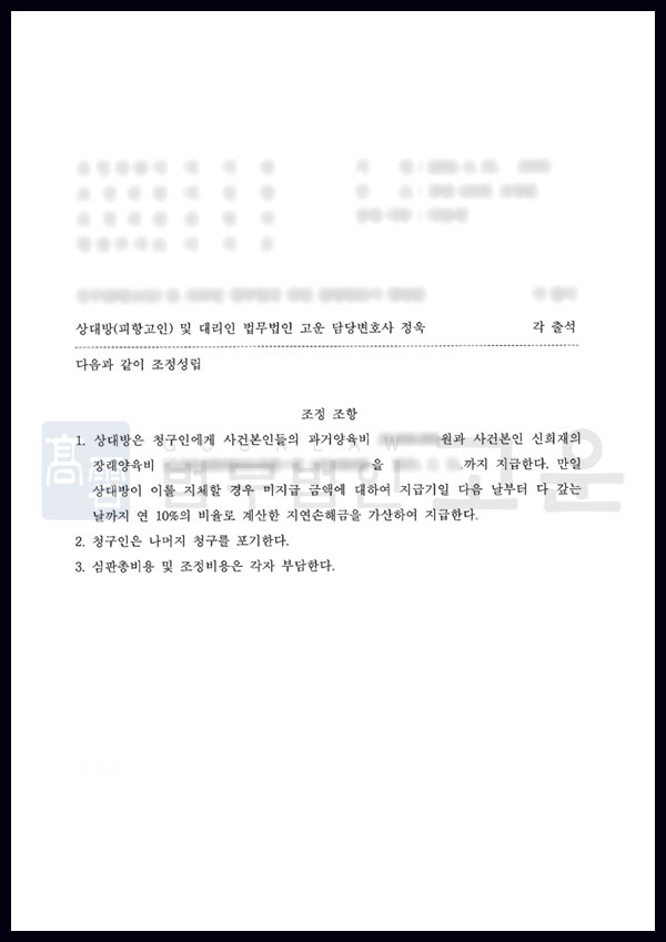 결국 추후 지급해야 할 양육비를 포함한 기존에 받으신 조정조서 이후 양육비만 지급하는 조건으로 상대방과 원만한 의결조율을 통해 조정에 이르게 되었습니다.