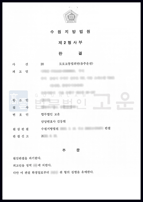 의뢰인은 음주운전 재범으로 1심에서 실형을 선고받았으나, 항소심에서 법무법인 고운을 선임해 대응하였습니다. 장기간의 정신질환, 충동적 범행 경위, 진지한 반성과 가족의 보호 가능성 등을 적극 소명하며 감형을 주장하여 항소심에서 원심이 파기되고 집행유예 판결 받은 사례입니다.