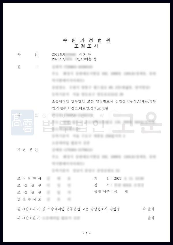 그 결과 조정 절차를 통하여 이혼 및 위자료, 재산분할, 양육자 지정 등에 관한 구체적인 사항에 대한 A씨의 입장이 대부분 받아들여졌고, A씨가 자녀의 양육자로 지정되고 B씨로부터 양육비를 지급받되, B씨가 청구한 위자료 및 재산분할금 또한 80% 감액하는 내용으로 조정이 성립되었습니다.
