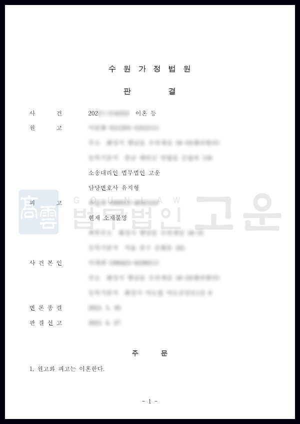 A씨는 배우자 B씨의 부정행위와 가출로 이혼소송을 제기했고, 법무법인 고운은 위자료·양육비 청구와 함께 공시송달을 통해 절차를 진행했습니다. 그 결과 위자료와 양육비 전액을 인정받고, A씨가 친권·양육권을 확보한 채 이혼에 성공했습니다.