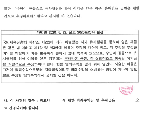 법무법인 고운은 추징금이 과도하게 산정되었다는 점, 그리고 그 과도하게 산정된 사실관계가 무엇인지를 밝혀내는데 성공하였고, (자세한 사실관계는 개인정보 보호를 위해 일부 생략합니다) 추징금 산정과 관련된 대법원 법리에 비추어 볼 때 추징금이 사실, 법리에 맞는 금액으로 적정히 감액되어야 한다는 점을 주장하는 변호인의견서를 제출하였습니다.
