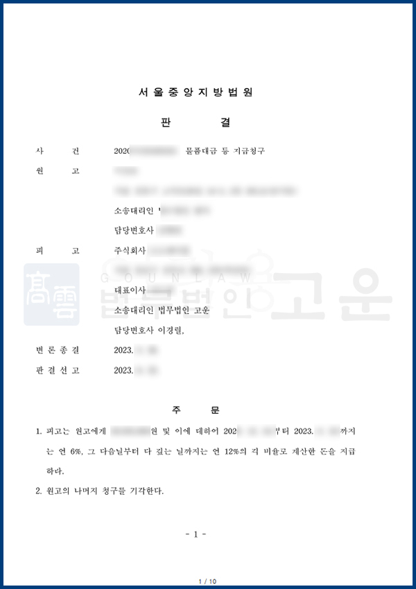 재판부는 법무법인 고운의 주장을 대부분 인용하여, 원고 B사가 납품한 물품 대부분은 A사와 협의 없이 발주한 것이므로 물품대금을 청구할 수 없다고 판결을 내렸고, 원고가 청구한 금액에서 약 85%를 감액할 수 있었습니다.