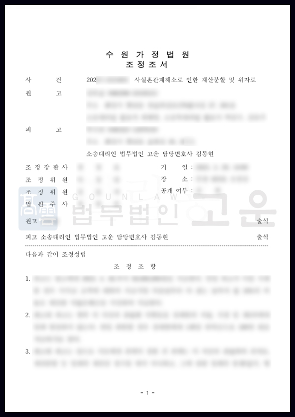 결국 조정을 통해 B씨의 위자료 청구는 모두 기각되었습니다. 또한 B씨가 청구한 재산분할 금액의 50% 이상을 감액하는 결과를 이끌어 내는데 성공하였습니다.