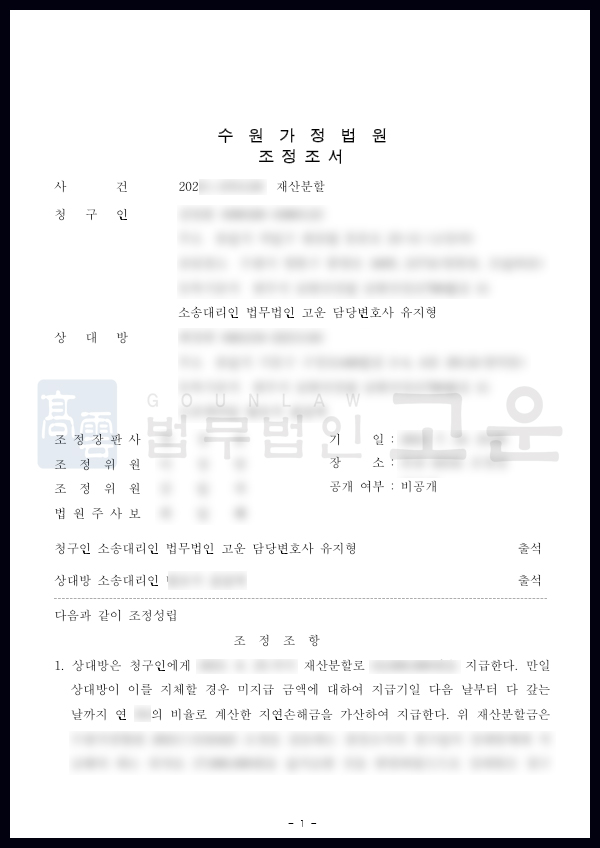 결국 법무법인 고운의 조력으로 A씨는 B씨의 재산 처분 및 은닉을 막고 조정을 통해 A씨가 청구한 재산분할 금액의 90% 이상을 인정받게 되었습니다. 신속하게 이루어진 재산분할 심판 결과에 A씨는 매우 만족하였습니다.