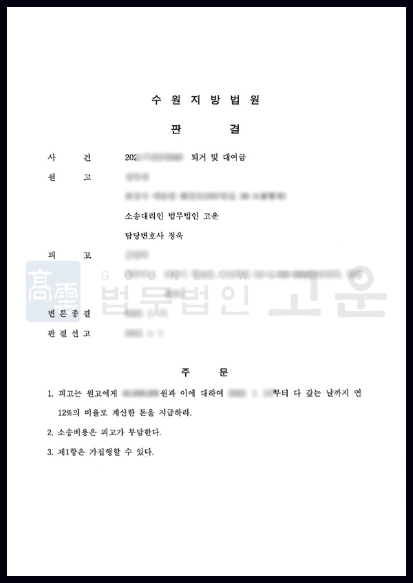 나. 이에 법무법인 고운은 의뢰인의 여러 증거들을 통하여 A의 B에 대한 대여금 채권을 입증하는 한편, B가 A의 주거에서 퇴거할 의무가 있음을 밝혔습니다.