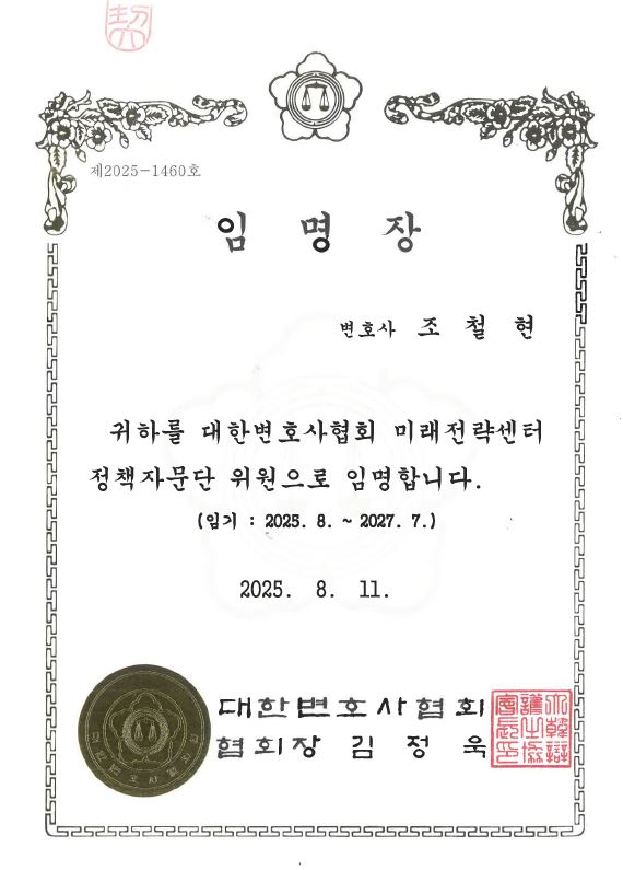 * 조철현 대표변호사, 대한변호사협회 미래전략센터 정책자문단 위원 위촉