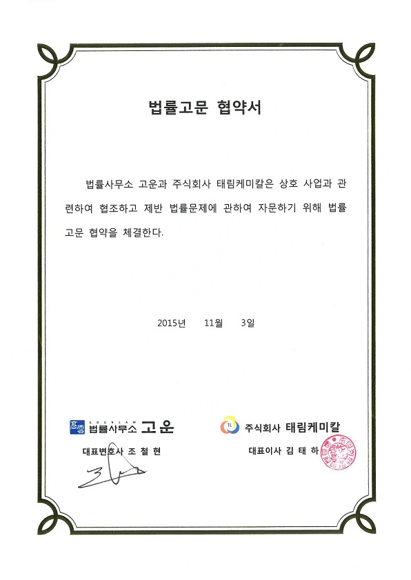 이번 고문계약은 저희 법률사무소 고운과 주식회사 태림케미칼의 상호 사업과 관련한 협조 및 제반 법률문제에 관한 자문을 위하여 체결되었습니다.