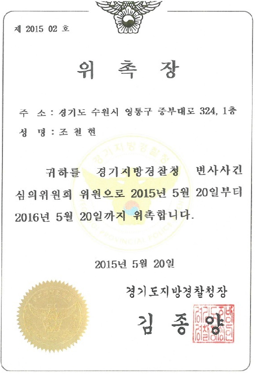 * 조철현변호사님 경기지방경찰청 변사사건 심의위원회 위원 위촉 2015-12-14 법률사무소 고운 조철현 변호사님께서 경기지방경찰청 변사사건 심의위원회 위원으로 위촉되셨습니다. 법률사무소 고운 전체 구성원은 경기지방경찰청과의 업무협조에 최선을 다할 것을 약속드립니다. 이전글 * 주식회사 태림케미칼과 고문계약 체결 다음글 * 이경렬변호사님 의왕 경찰서 상담 변호사 위촉 목록 보기