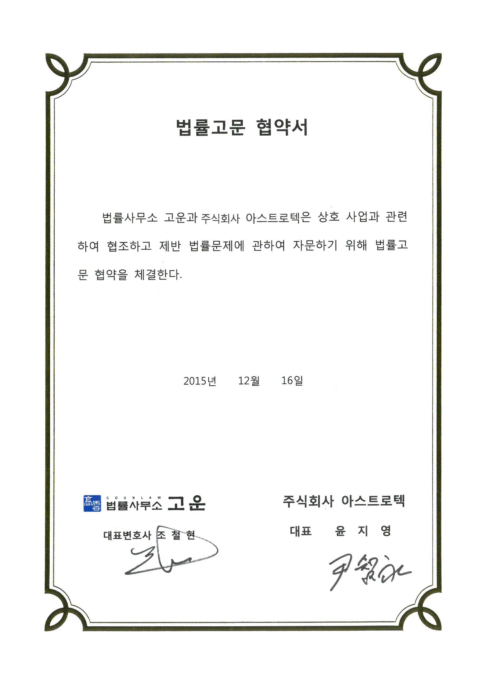 저희 법률사무소 고운은 2015. 12. 16. 주식회사 아스트로텍과 고문계약을 체결하였습니다.