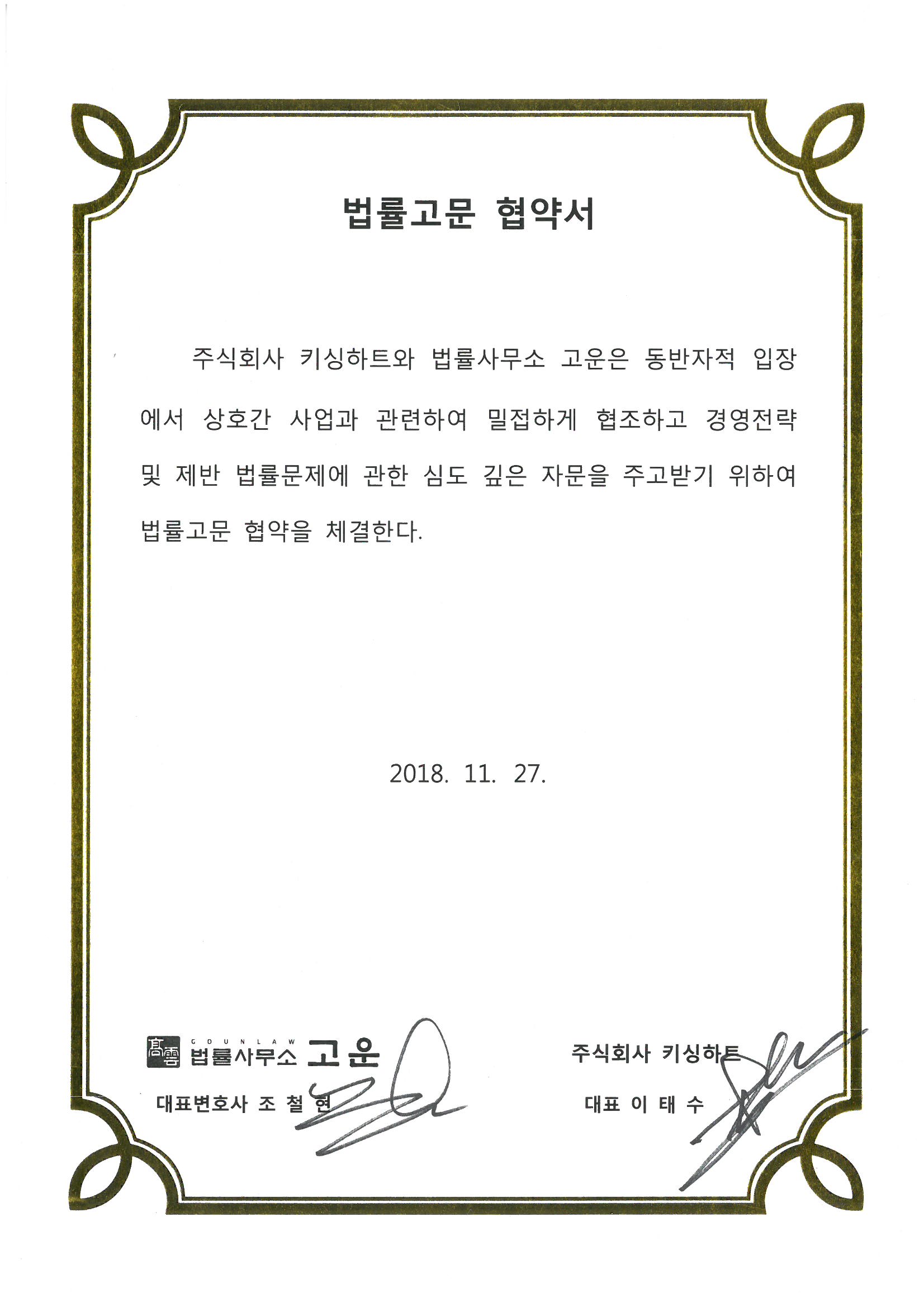 * 법률사무소 고운 ㈜키싱하트와 법률고문 협약 체결 2018-12-08 법률사무소 고운은 강다니엘 선글라스로 유명한 주식회사 키싱하트와 법률고문 협약을 체결하였습니다. 법률사무소 고운은 주식회사 키싱하트에 상호 사업과 관련하여 밀접하게 협조하고 경양전략 및 제반 법률문제에 관한 심도 깊은 법률서비스를 제공 할 예정입니다. 법률사무소 고운은 앞으로도 기업 자문 분야의 역량 강화를 통해 고객들에게 수준 높은 서비스를 제공하도록 하겠습니다. 이전글 * 법률사무소 고운 변호사님과 직원의 환영회 겸 회식 진행 다음글 * 김민정변호사님, 최고의 법률시사지 리갈타임즈에 이혼과 관련된 중요한 네가지로 게재 목록 보기