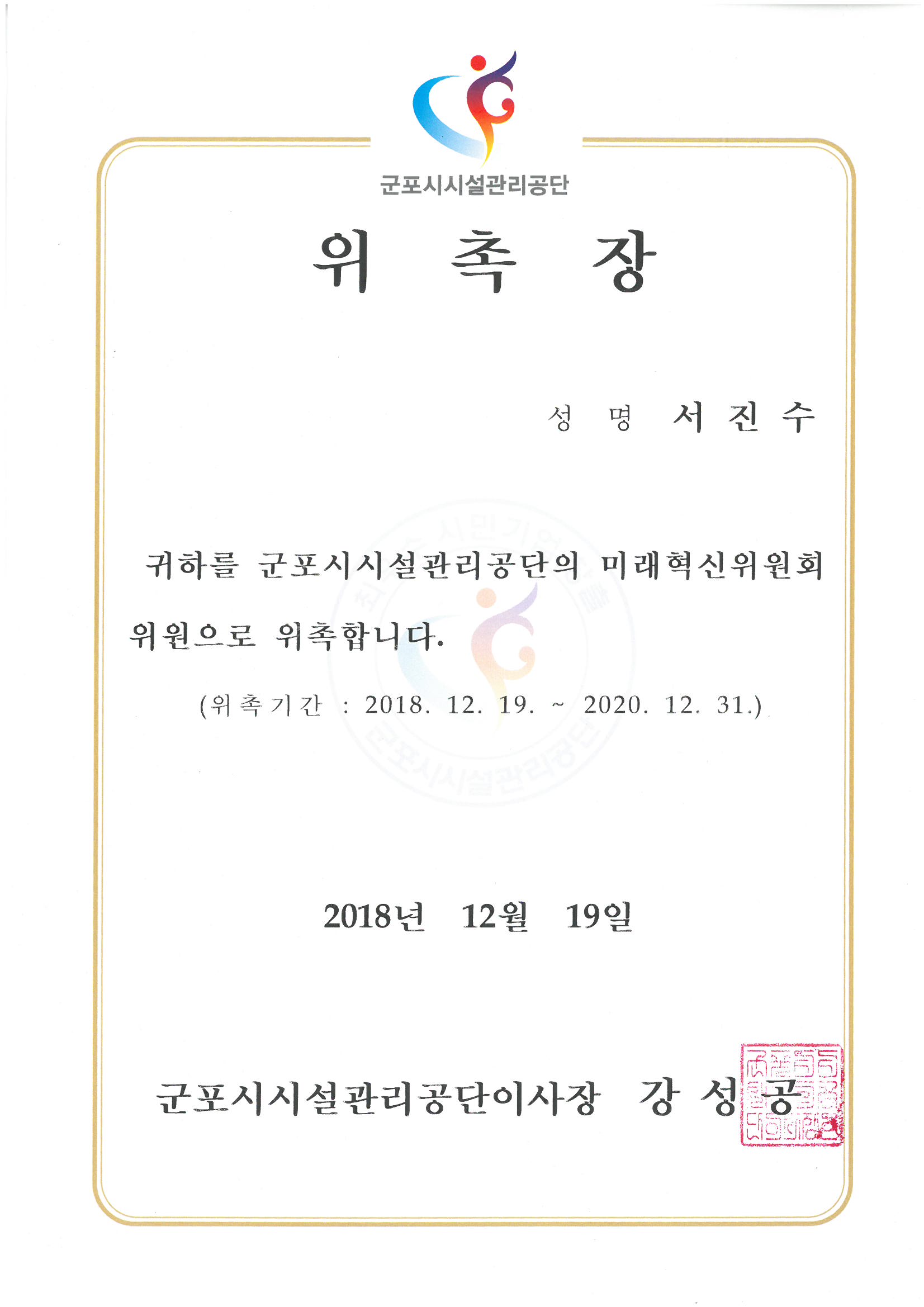 법률사무소 고운의 서진수변호사님은 군포시시설관리공단(이사장 강성공)으로부터 미래혁신위원회 위원으로 위촉을 받았습니다.
