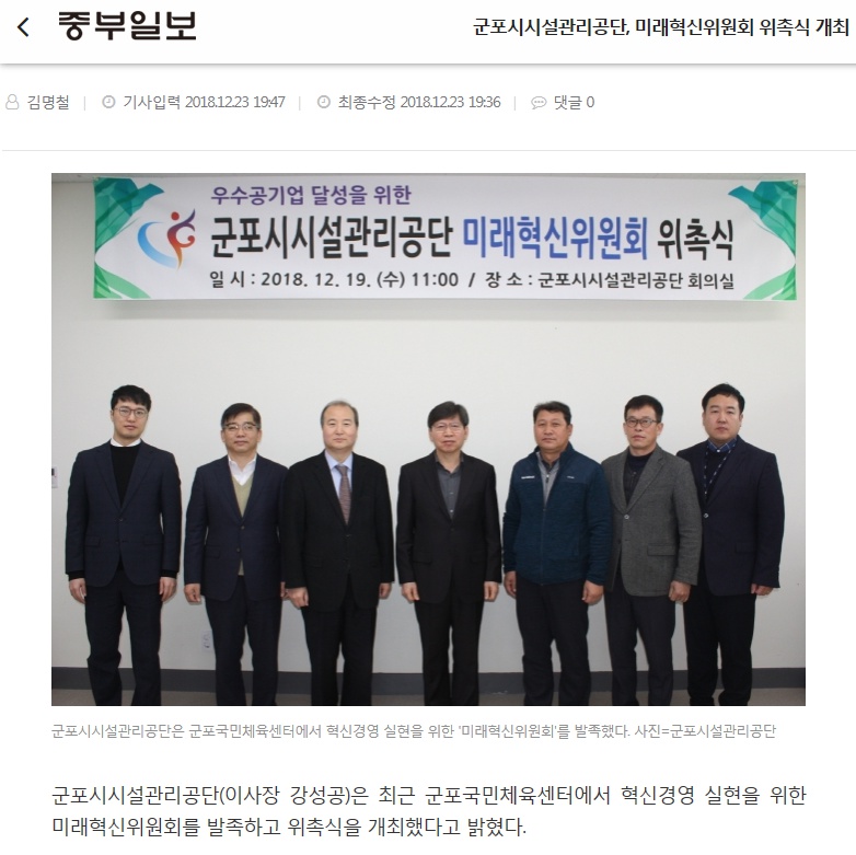미래혁신위원회 구성은 시민 정책참여 실현을 위하여 변호사, 노무사, 대학교수, 정책연구소장 등 시민 전문가 4명과 당연직 3명으로 운영이 될 것이며, 서진수변호사님은 앞으로 군포시설관리공단의 우수공기업 달성을 위해 법률문제에 있어 최선을 다하여 자문을 하기로 약속하였습니다.