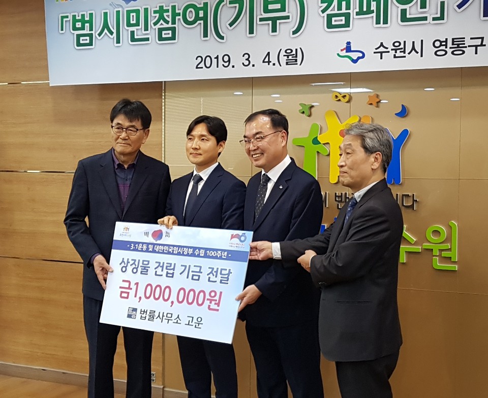 2019. 3. 4. 수원시 영통구청에서 3.1운동 및 대한민국임시정부 수립 100주년 기념물 건립을 위한 기부금 전달식이 있었습니다.
