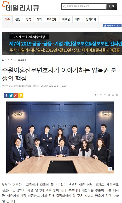 데일리시큐는 ‘양육권 분쟁’에 대하여 취재를 하던 중 수원지역을 대표하는 이혼전문 로펌인 법률사무소 고운에 관련 내용 자문을 요청하여 취재가 이루어졌고, 데일리시큐는 이를 바탕으로 하여 2019. 3. 22. ‘수원이혼전문변호사가 이야기하는 양육권 분쟁의 핵심’이라는 기사를 게재하였습니다.