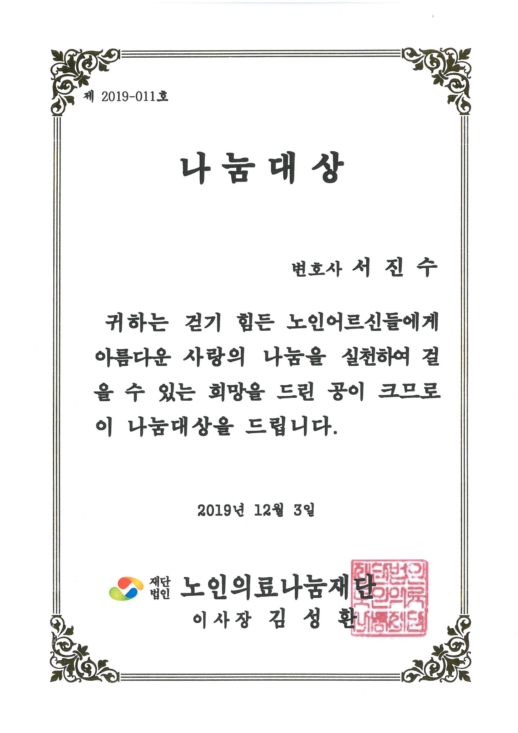 이에 노인의료나눔재단에서는 서진수변호사님의 공을 인정하여 나눔대상을 수여하였습니다.