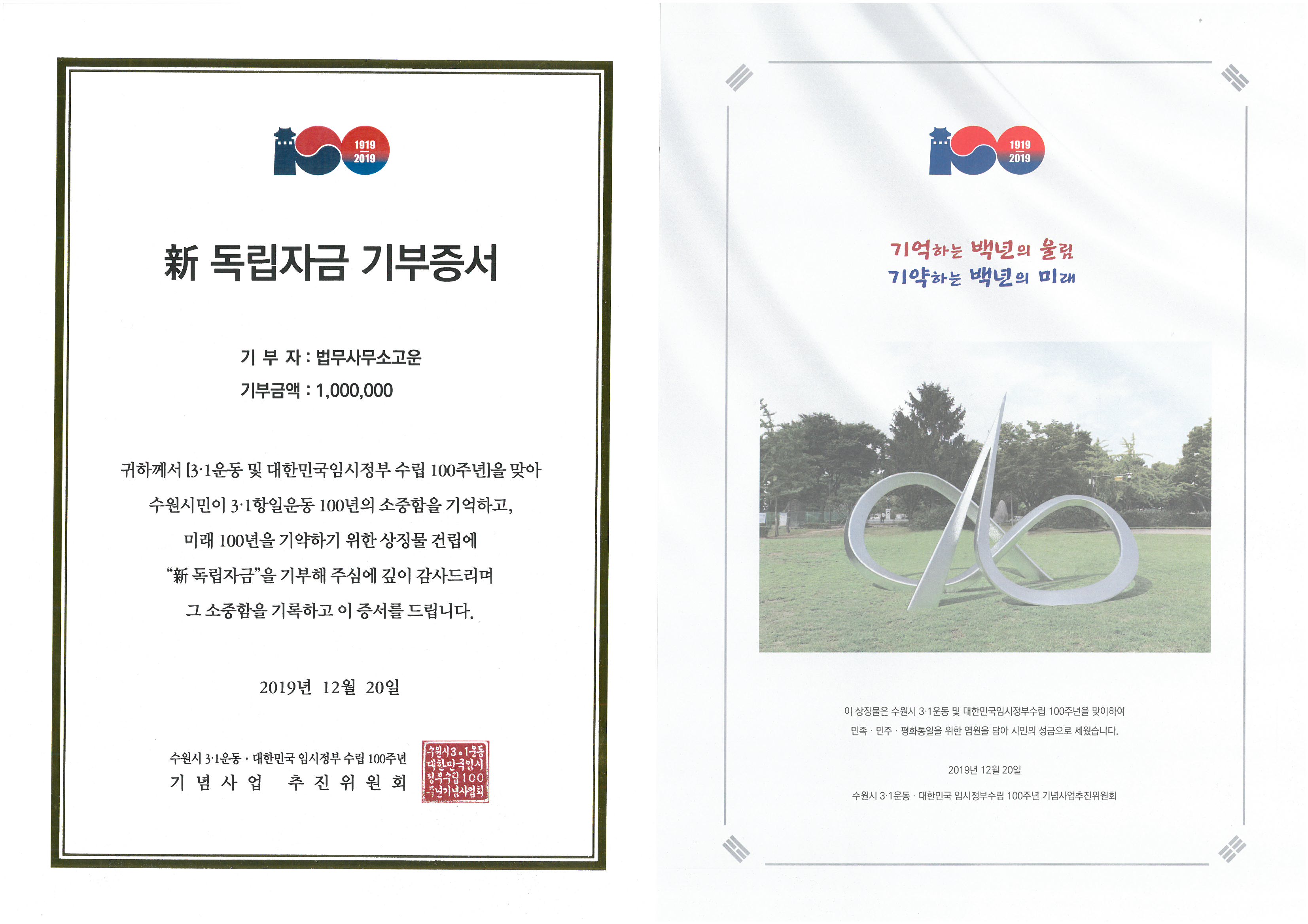 법무법인 고운은 “3·1운동 및 대한민국 임시정부수립 100주년 기념사업 추진위원회”에 기부금을 전달하였으며, 2019.12. 20. “수원시 3·1운동 및 대한민국 임시정부수립 100주년 기념 상징물 제막식”에 초대받았습니다.