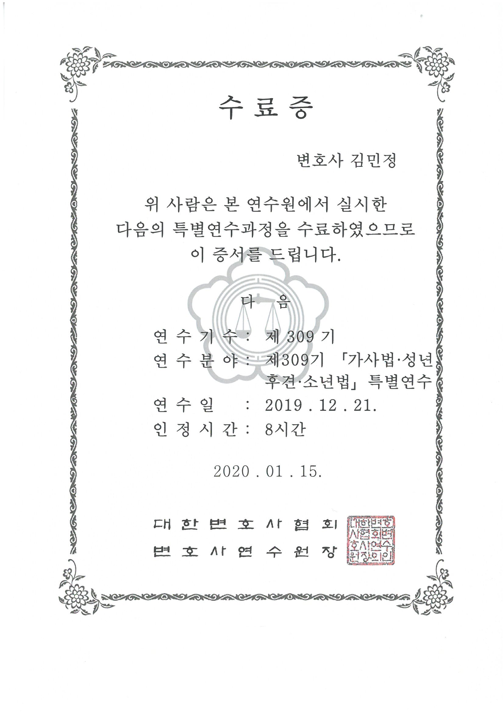 * 대한변호사협회 가사법·성년후견·소년법 특별연수과정 수료 [김민정변호사님]