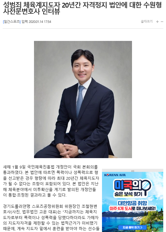 법무법인 고운의 조철현대표변호사님이 일간스포츠에 “성범죄 체육계지도자 20년간 자격정지 법안에 대한 수원형사전문변호사 인터뷰”로 언론보도되었습니다.